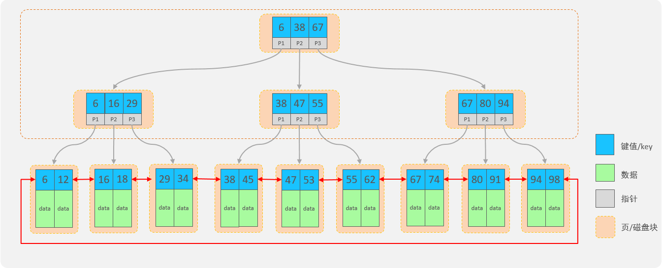 - 为了提高范围查询效率,叶子节点形成了一个双向链表,便于数据的排序及区间范围查询