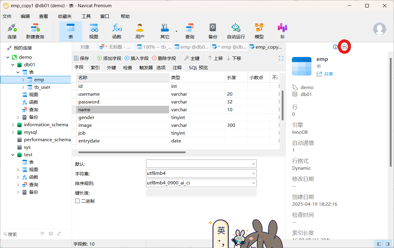 关于表结构的查询操作,工作中一般都是直接基于图形化界面操作。